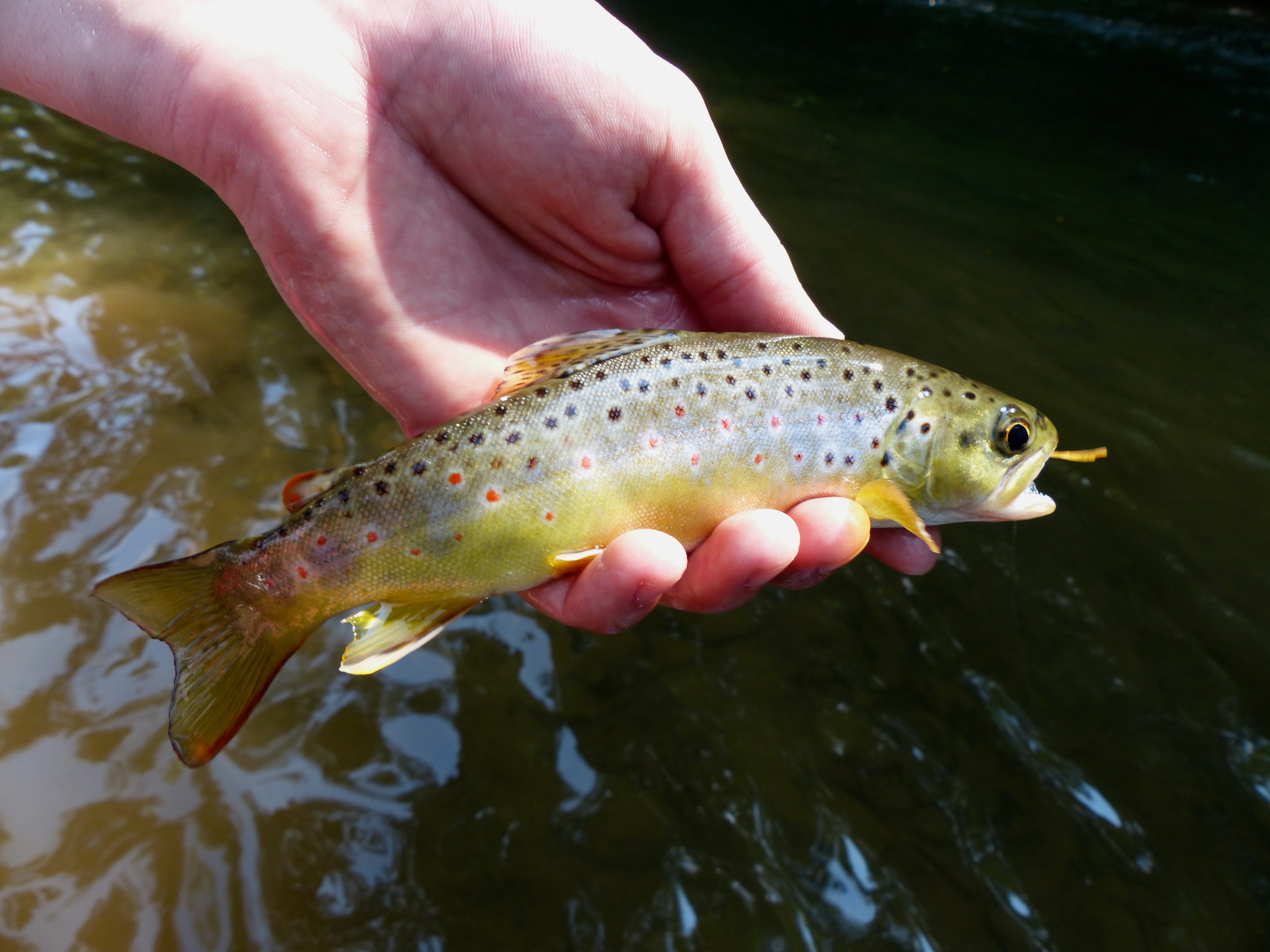 With the Gunpowder River at 92 CFS and peaking at 52°F at Falls Road, fishing the last couples days has been great. We have seen fish looking up and willing to take a variety of patterns. Fishing small caddis in a tan or dark brown has been the most productive method but many have started to fish small ants and beetle patterns on the river. Many fish have been holding on the banks of the river, so be sure to make a cast or two before you get into the water. You will be surprised where some of the little browns will hold. If fish are not rising many have had success nymphing small caddis pupa and zebra midges. The fish above fell for a little beetle pattern fished along the bank. As long as the weather holds true, fishing should be great this upcoming weekend. Swing in the shop on your way to the river and pick up a couple small terrestrials like the hoppers below tied by Rainy’s Flies.