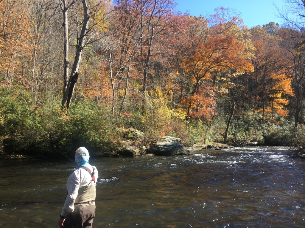 The Gunpowder River is flowing at 321 CFs and is 60 degrees F. The upper river is clearing and dropping nicely. Streamer sink- tip techniques should move quite a few fish in these flows. A better bet if you’d like to hook and land a few would be to seek out the flat water and spend some time fishing Olives and midge emergers in the #18-22 range. It’s not to late to fish a large hopper-and dropper rig leaping frogging the boulder pools and covering more water. We’ve found a lot of new folks fishing right on top of each other in the past few weeks so be sure give everyone a stretch of water to themselves. Fly fishing, after all is not widely known as a group sport. A good rule of thumb is to yield to anglers fishing upstream. That is–a dry fly presentation won’t spoke fish nearly as bad swinging a streamer through a pool. If you can throw a rock and hit another angler it’s likely that you are too close ask as a courtesy which direction they are fishing and leapfrog around and continue fishing. Sadly, the lower river below Bluemount and the confluence of Little Falls is still too high to safely fish at 518 Cfs. The above photo from Gene Howson shot Monday shows leaves in full color along the river corridor, clear water and a hopeful drift.