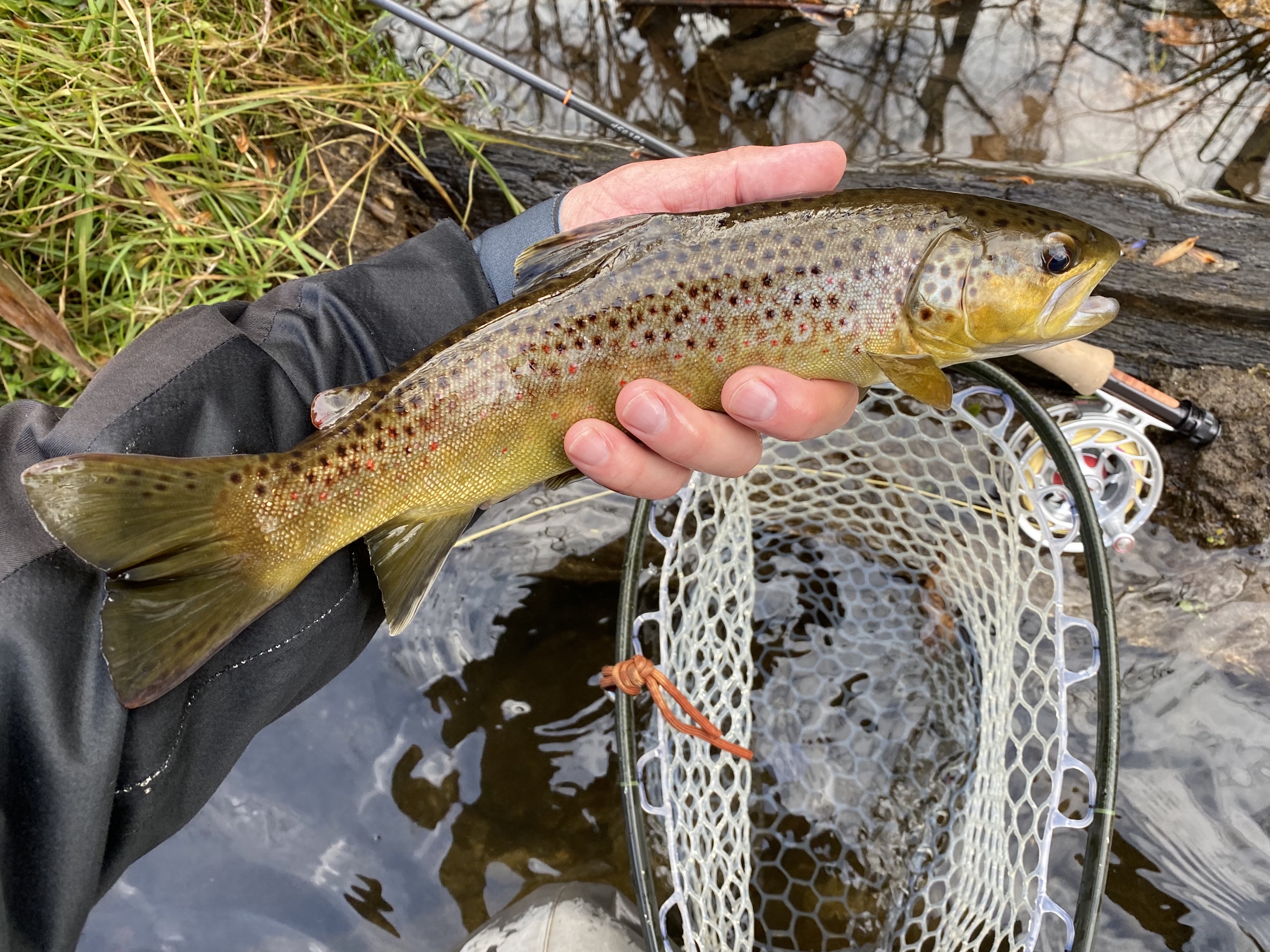 The river’s up to 229 cfs at Falls road after overnight rain. This, along with the dark dreary weather, presents an ideal situation for those wanting to fish streamers. Thanks to Jim for the photo of the colored up fish caught recently doing just that.