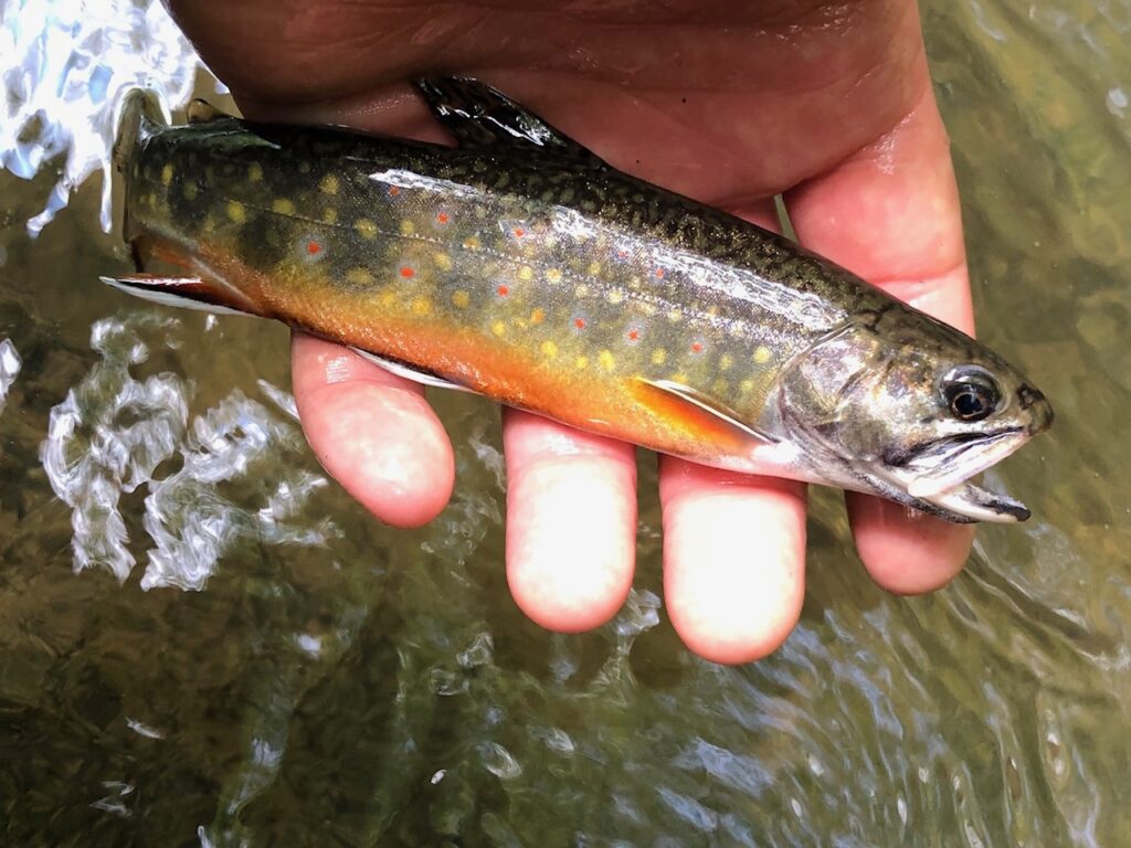 The Gunpowder River is flowing at 101 Cfs, 55 degrees and clear. Many of us have been waiting all year for these ideal conditions. Plan on seeing a mix of sulphurs, #16-18 caddis and #18-22 midges out there. Wild fish are always a little tricky on bright days so fish early or late if you can. Avoiding “parking lot” water and focusing on riffles is a good bet. Leader length is the 9 to 12 foot range ending in 7x can make all the difference in turning a follow into a take. Thanks to Keir Joyce for the wonderful photo of a Gunpowder River Brook trout and the following stream report from May 26th.