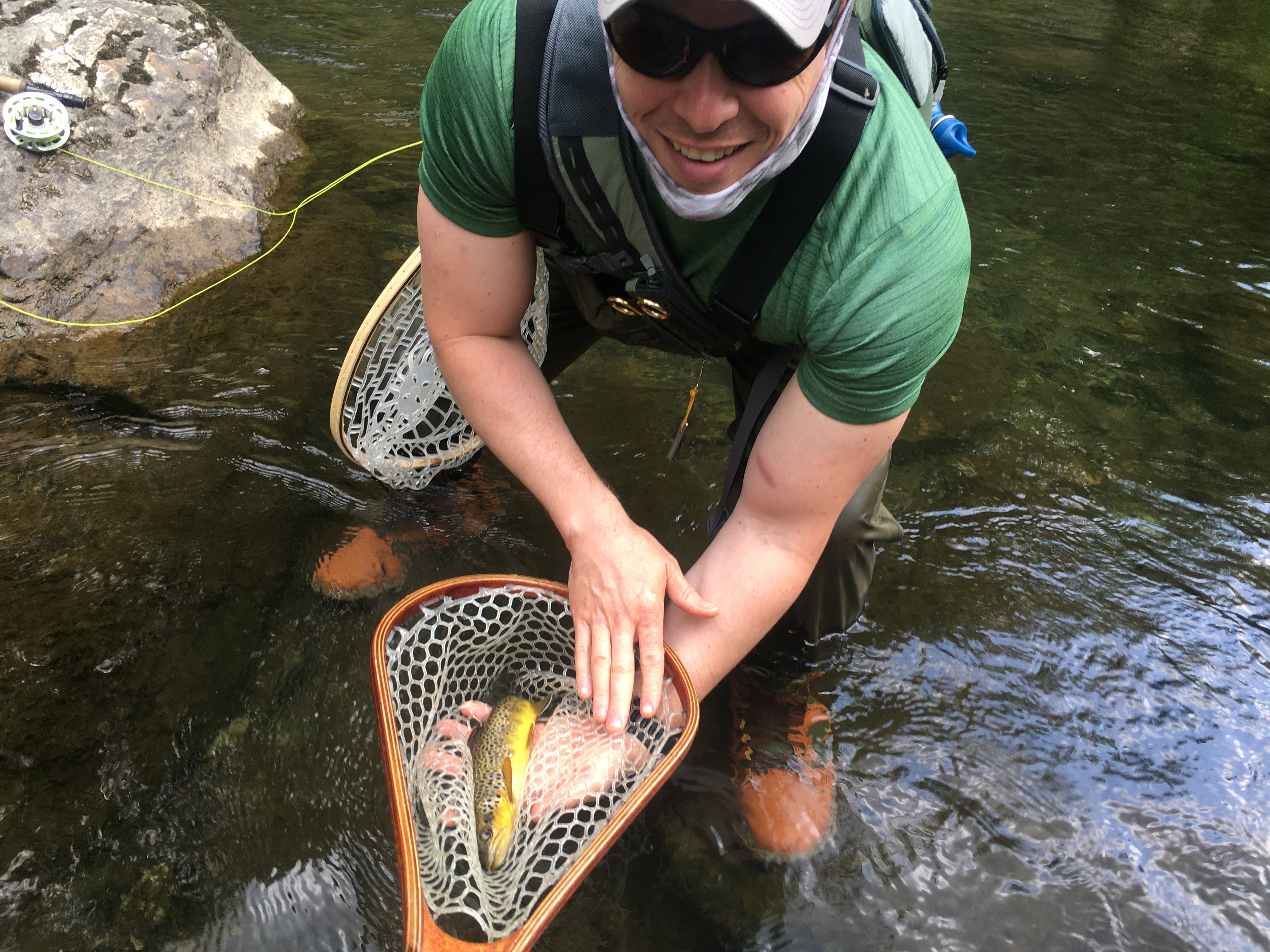 The fish above was David’s first trout on a fly rod, caught on a dry fly during a guided trip, call or email to book a trip to tune up your game or get started into the sport whilst the river levels are ideal.