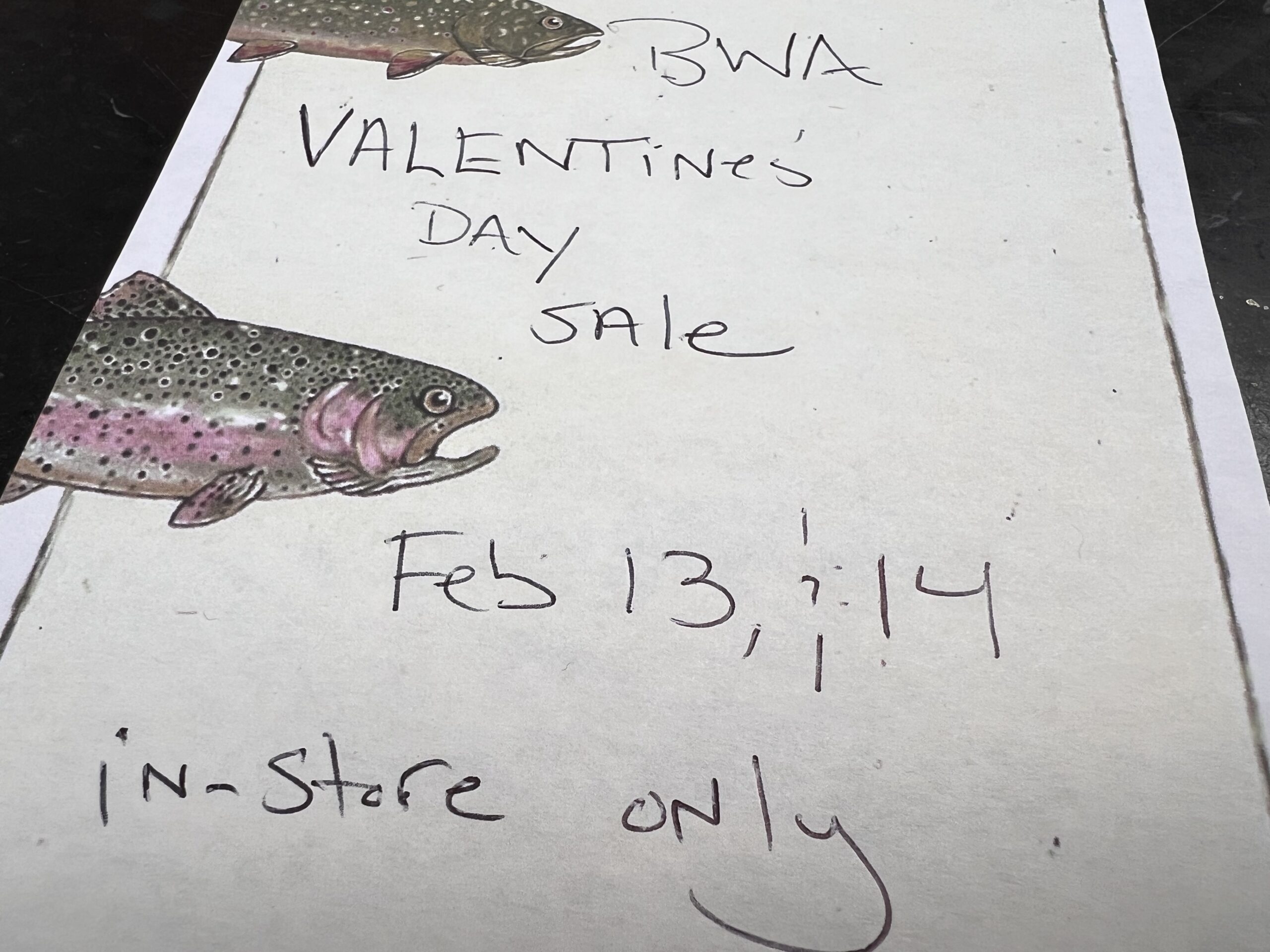 The trails along the Gunpowder River are still treacherous and it’s not reasonable to think about getting out and reasonably flyfishing until the snow and ice along the trails let’s go but If you’re feeling cooped up, have a fish story and want to prep for better weather please stop in February 13 and 14th from 10AM till 3PM and save up to 50% on in-stock items and take advantage of selected Buy One Get One free items that are sure to warm your heart!